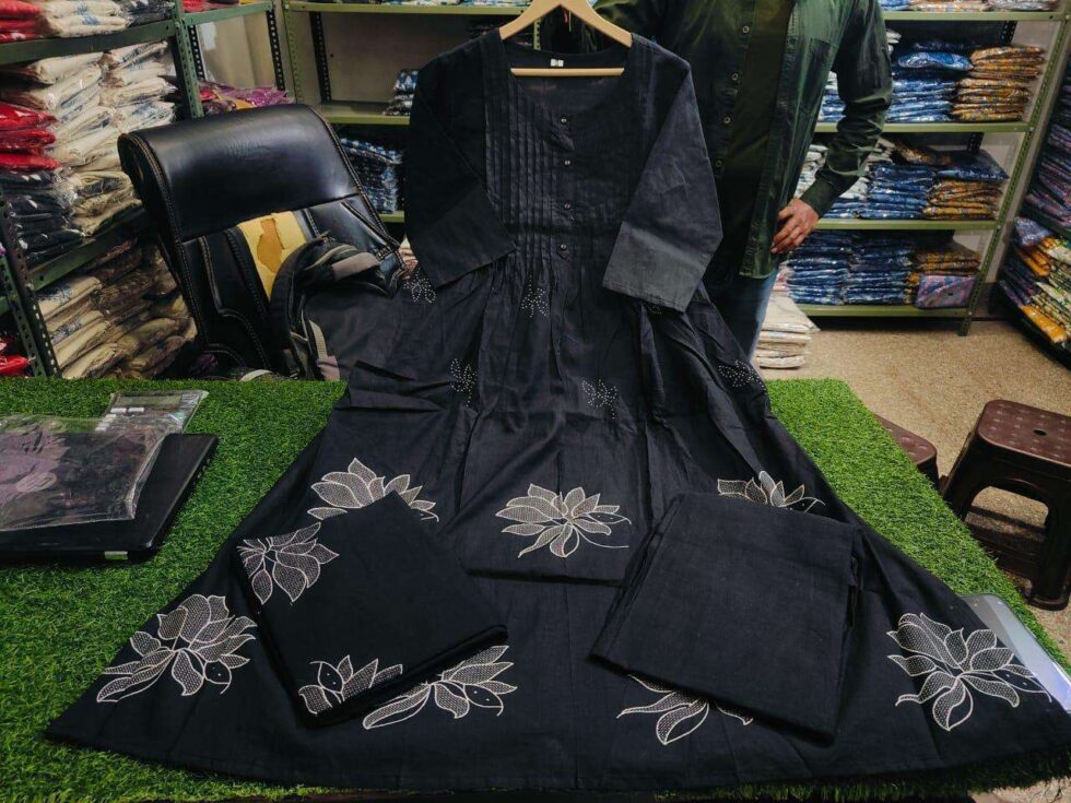 Black Long Kurta having Discharge Floral Print and Printex, Pants & Dupatta Size-XL